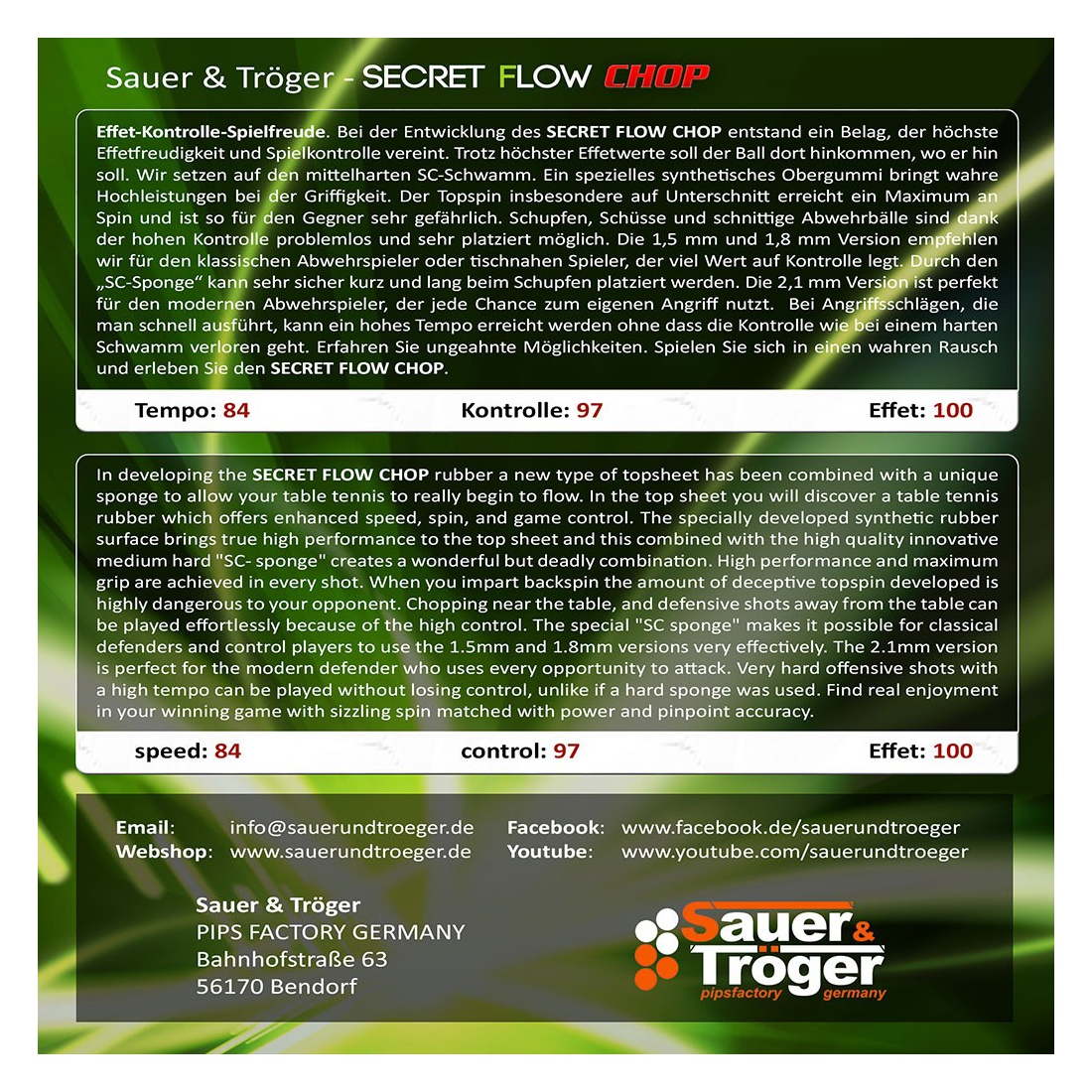 Špeciálne vyvinutý syntetický povrch poťahu Sauer & Tröger Secret Flow Chop prináša vysoký výkon, v kombinácií so stredne tvrdou SC-špongiou pre maximálny grip pri každom údere. Vďaka vysokej kontrole môžete zahrať chopy blízko stola a defenzívne údery aj z väčšej vzdialenosti. Verzie hrúbky 1,5 a 1,8 sú zamerané na klasickú obranu, verzia 2,1mm je skôr pre moderného obranára, ktorý využíva každú možnosť na rýchly protiútok. Tvrdé ofenzívne údery sa dajú zahrať vo vysokom tempe bez straty kontroly.